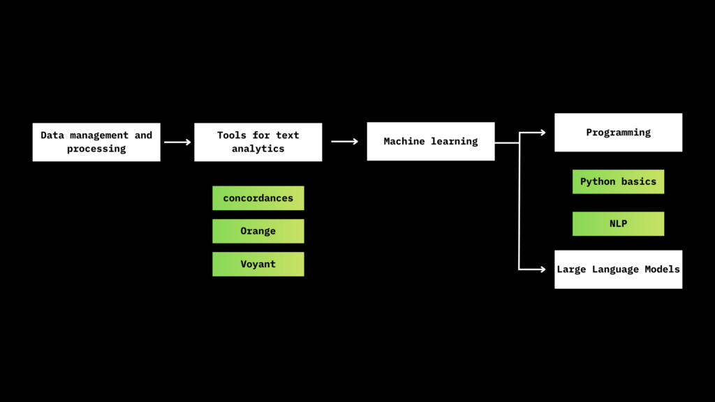 First, it is essential to understand the data, as covered in the Data Management and Processing course. Next, we proceed to high-level analysis using no-code tools such as concordancers, Voyant, and Orange. After this, participants are introduced to the key concepts of machine learning, gaining at least an overview of its main techniques and approaches. Finally, they can choose to advance further by learning programming (Python, NLP) and/or exploring how to use large language models (LLMs) effectively in research contexts.